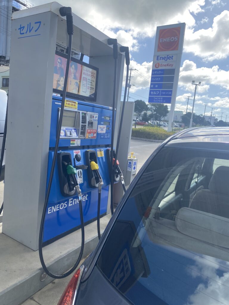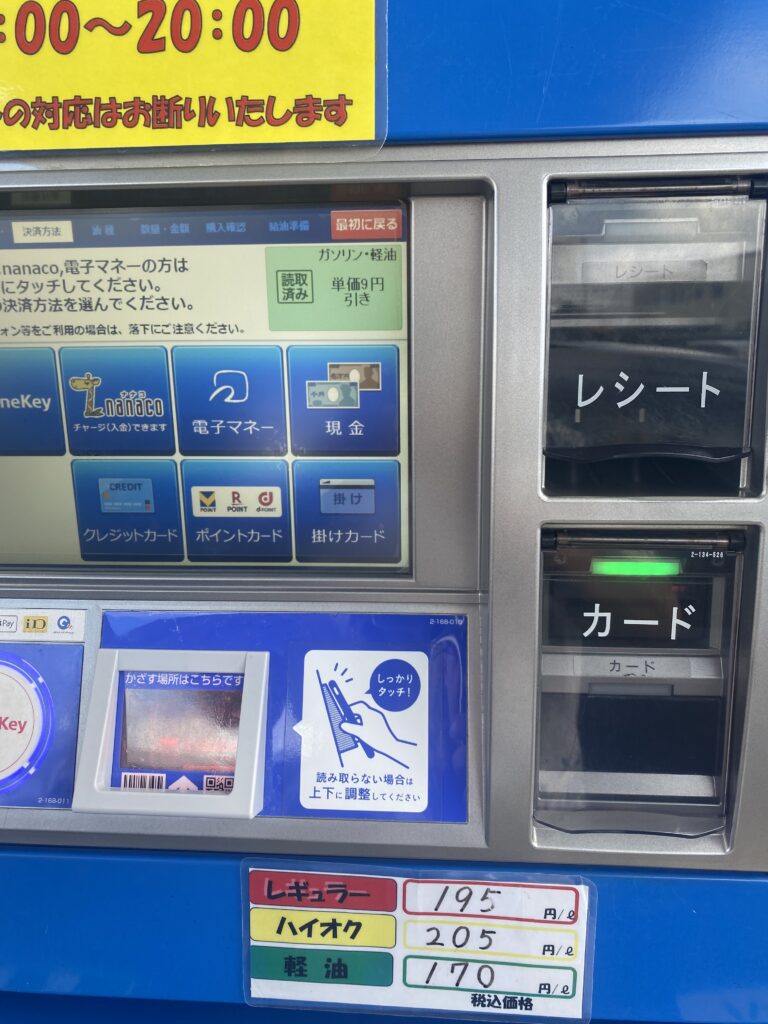 ガソリンスタンドで給油をします。スマホアプリで9円割引になり184円。前回より1円の値上りです。