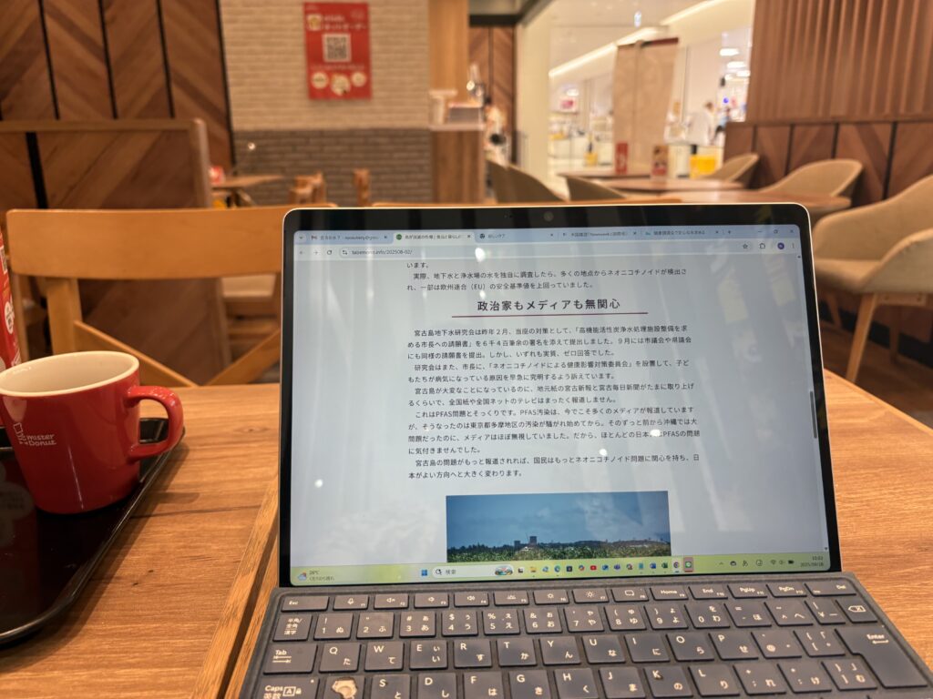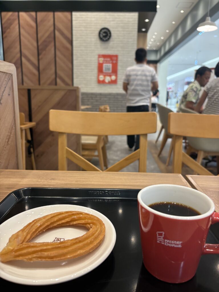 9時40分【ミスタードーナツ】に入ります。昨日は柔らかいドーナツが食べづらかったので、今日は硬いハニーチュロを食べます。時間はかかりますがこちらの方が食べやすいです。途中同友会の友利支部長が声をかけてくれました😃。2時間仕事をしました。