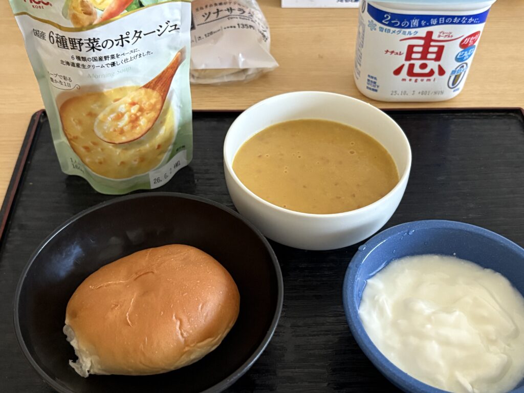 帰宅後昼ご飯にします。昨日買った野菜ポタージュスープがおいしいです😋。あとはツナサラダパン1個とヨーグルトです。食後に東京で買って来た双眼鏡をチェックしました。メガネをかけたまま使えて大変便利です🤗。