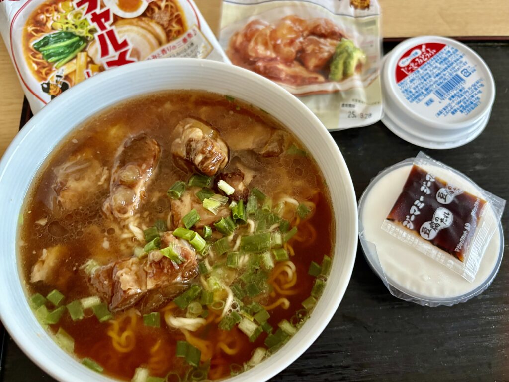晩ごはんに今日賞味期限の「ローソンセレクト沖縄ソーキ」をチャルメラに載せて食べると、高級中華のラーメンの味になりました🤗。ソーキは柔らかいので、奥歯がなくても美味しく食べられました😃。