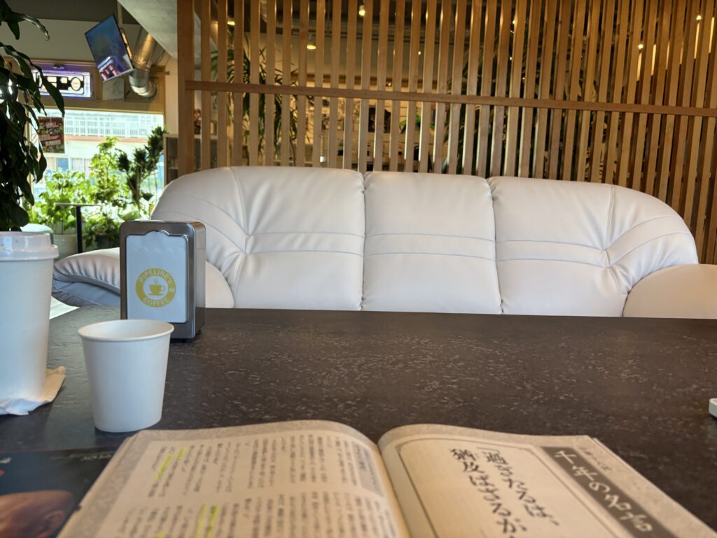 14時に役員会が終わり、車で移動し2分で到着。【PIPELINE】に入るとカウンターにいるりょうが開口一番“今日はおひとりですか😃”“そうだよ😃”と答えて、アイスホワイトモカをオーダー。“ゆっくりして行って下さいね😃”と言って奥のソファ席に案内してくれます。ドリンクを飲んでしばらく休憩した後、のんびり読書をして過ごしました。のんびりしたい時はここに来ようと思います😃。