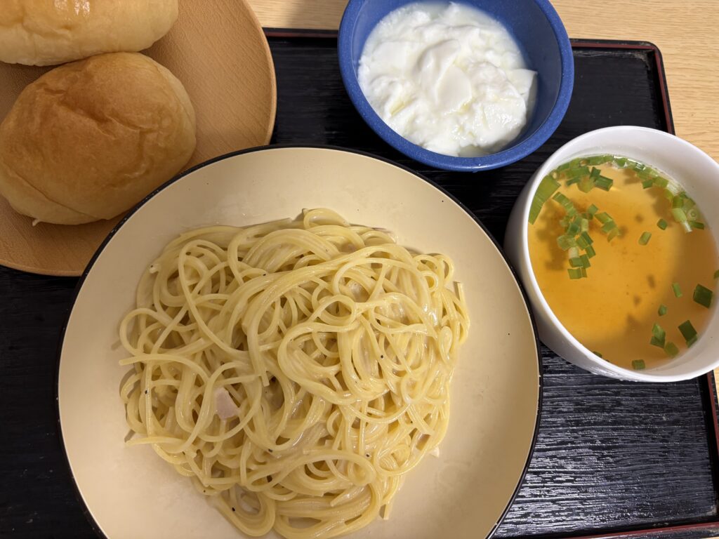 晩ごはんは無印良品のパスタソースでスパゲティーを作ります。今日はカルボナーラです。3袋入りで450円、つまり1袋150円です。市販のパスタソースより安くておいしいです😃。夜はベッドに寝転んで読書をしたり、YouTubeを見ました。