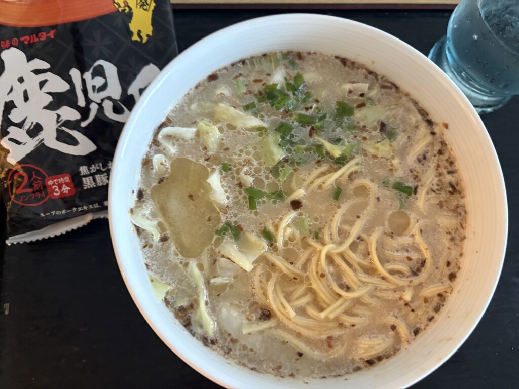 昼ごはんはマルタイの鹿児島ラーメンです。今日もキャベツをたっぷり載せました😃。