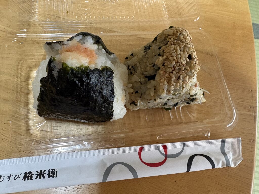 帰りに【おむすび権兵衛】でおにぎりを2個買います。オープンがたしか2004年なので、もう20年以上続いています😊。今日の昼ごはんは明太子とじゃこ玄米おにぎりでした😃。