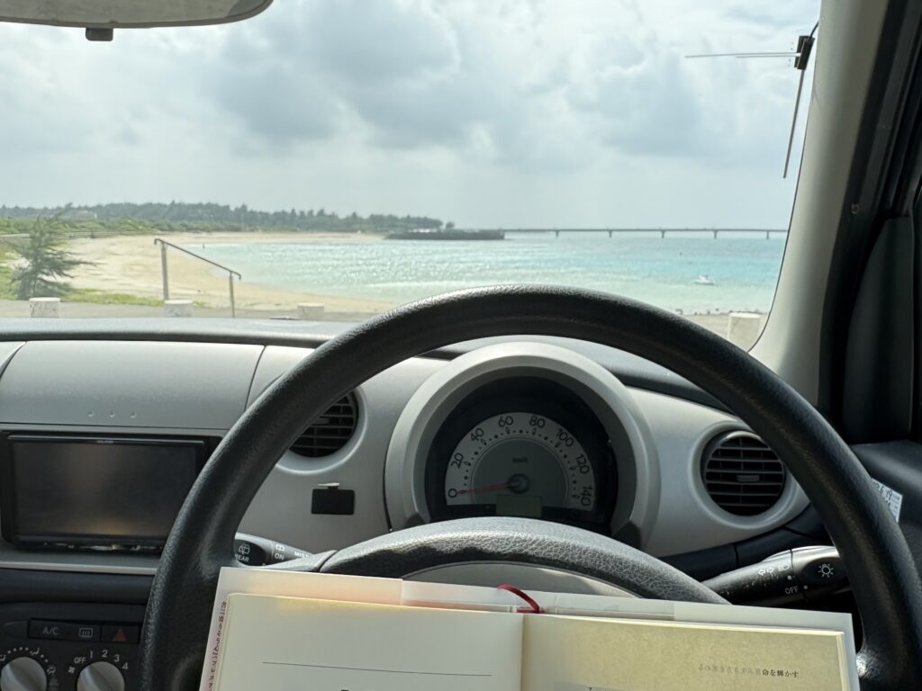 ウォーキングの後は車中で読書をします。曇り空なのて眩しくなく、普通に本が読めます。まだ室内と同じようには行きませんが、極めれば贅沢な時間になります🤗。