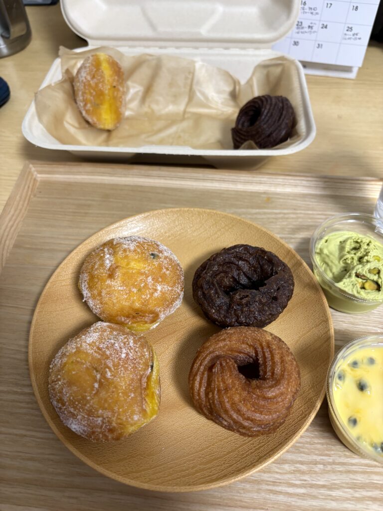 帰宅後すぐインスタに動画をアップ。まずドーナツ1個とフレンチクーラー1個を食べます。人気店2店の夢のコラボです🤗。18時ごろ4種類に2種類のディップ(GONBEEのピスタチオ/huitのリリコイカスタード)に付けて食べます。至福の時間です😋。1時間後残りの2個を食べました。夜ご飯は食べなったです。