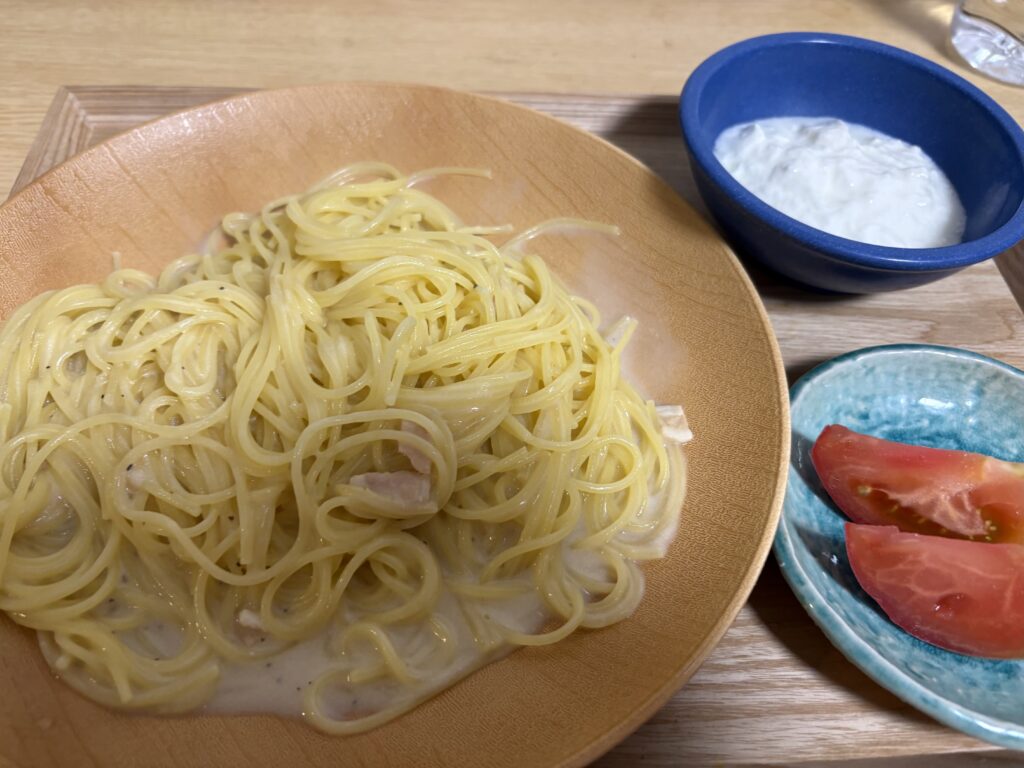 帰宅後、インスタのリール動画とストーリーズにアップ。その後明日のミーティングの準備作業をして晩ごはんにします。疲れていたので無印良品のパスタソースを使ってカルボナーラを作りました。