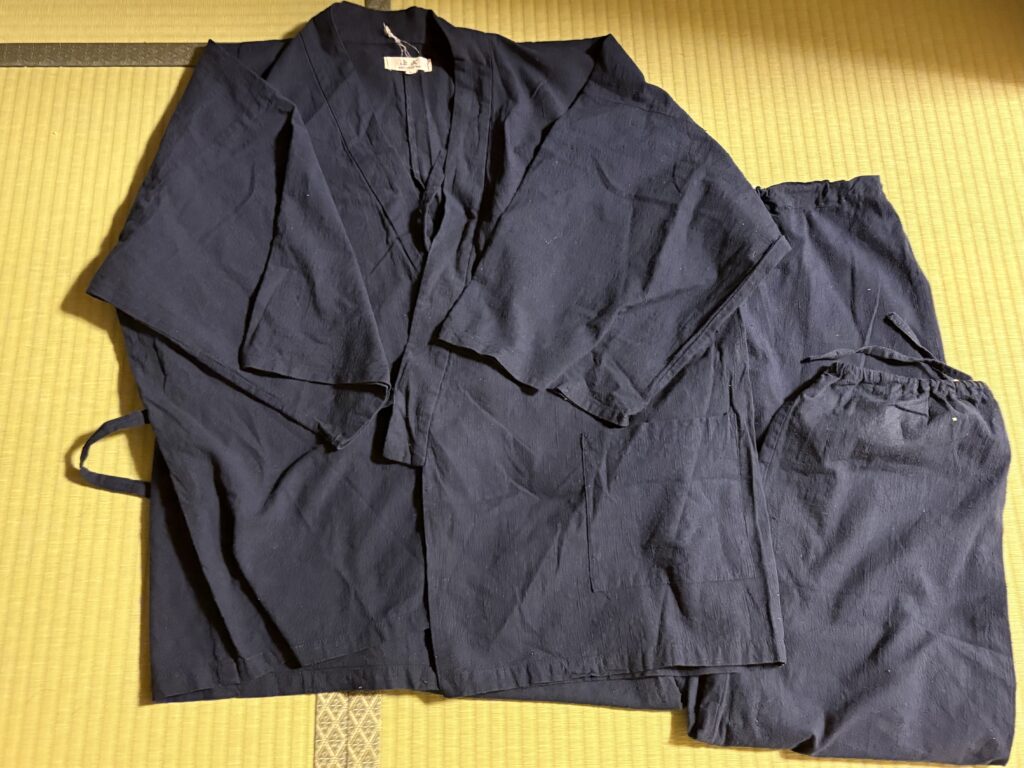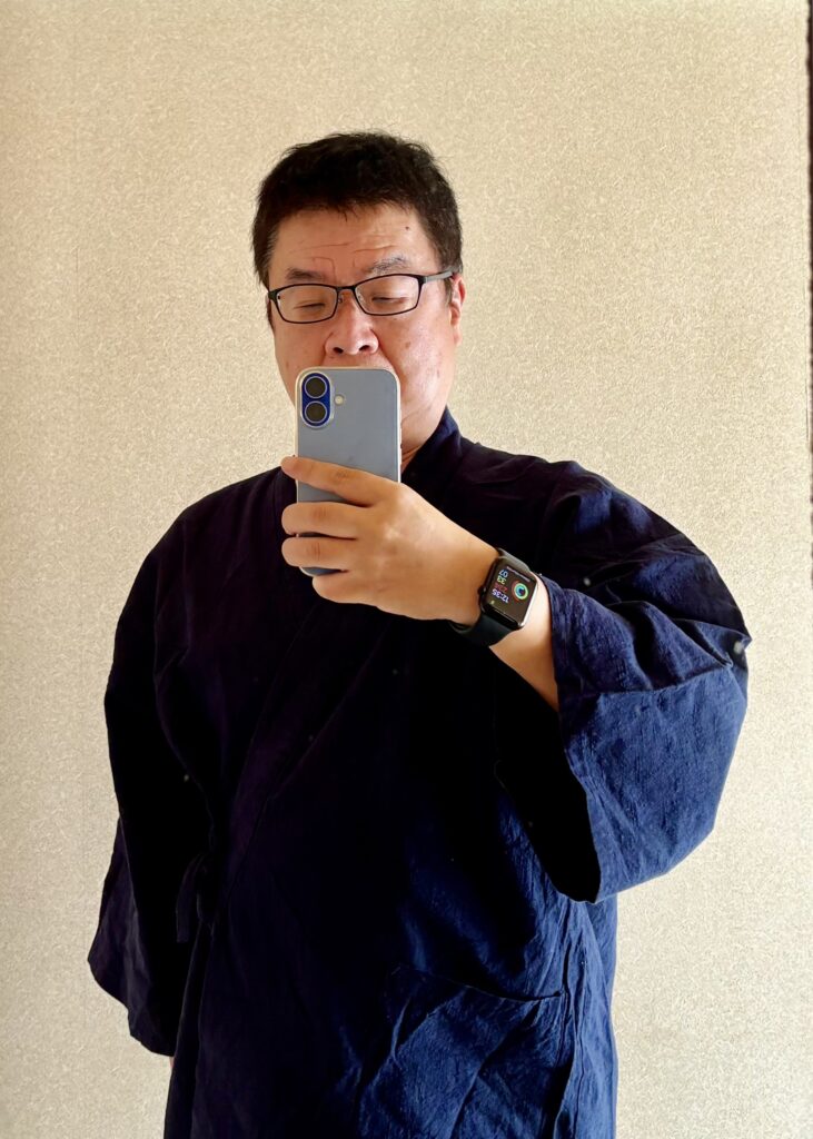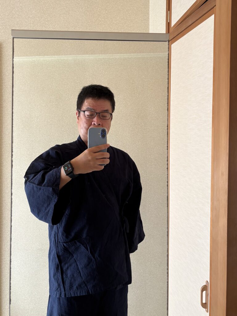 帰宅後クローゼットの収納ケースを整理していると作務衣を発見。昔ニューヨーク赴任時に、チームからのもらったプレゼントです😊。25年ぶりに袖を通します。体重が増え今のほうが似合っているように思えます。全身ミラーで撮影。編集で左右を逆転させてFacebook に投稿します(右下の画像)。予想外に反響がありました😄。