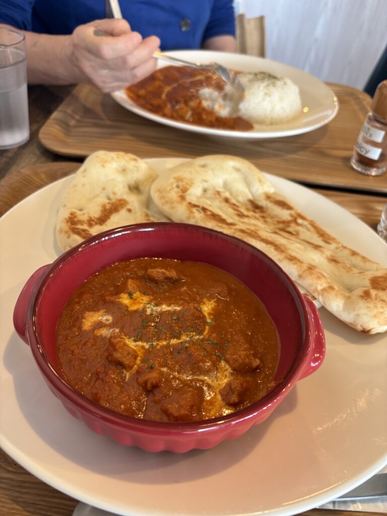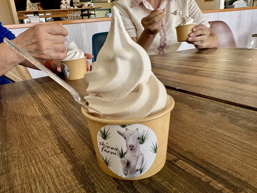 14時に支部役員会が終了。その後事務局のスタッフ、【リゾートライフ】の柿本さんと3人で支部会員企業を訪問します。車好きな事務局のスタッフに毎回運転をお願いしています。1カ所目は【しろう農園】、行くのは2年ぶりです。砂川社長に挨拶しソフトクリームを食べて帰る予定が、バターチキンカレーも食べることに💦。どちらもおいしかったです🤗。