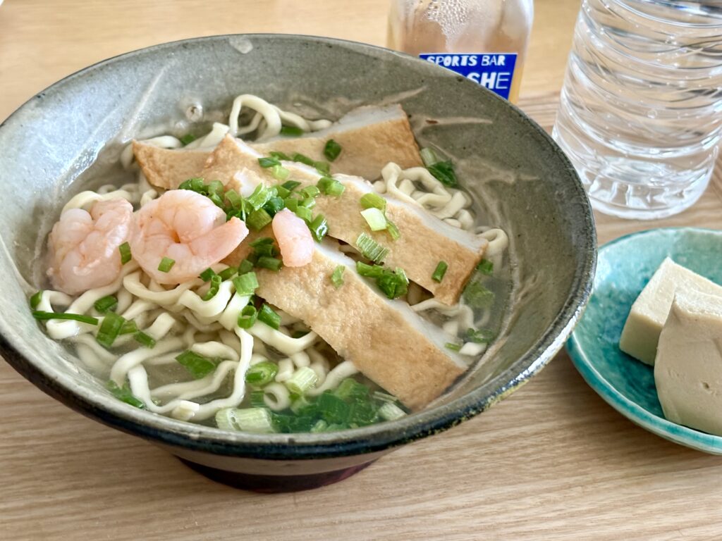 昼ごはんにローソンセレクトの沖縄そばを食べます。このちぢれ麺が好きです😊。