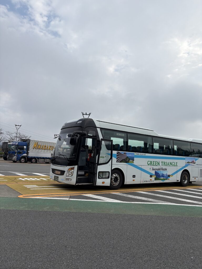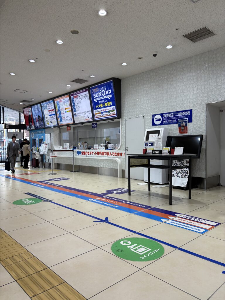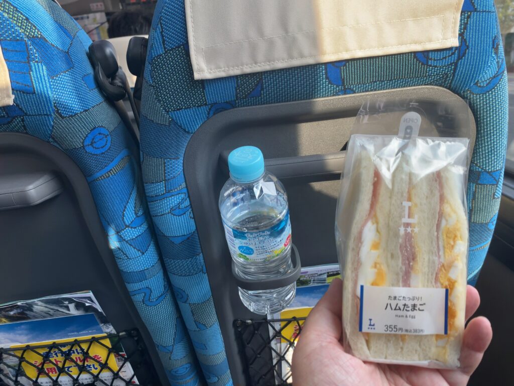 7時起床。今日は社員旅行でアナタビをご利用いただいた熊本の会社を訪問します。8:40ホテルをチェックアウト。徒歩30秒でバスターミナルに到着。【ローソン】でサンドイッチを買って、9:00発熊本行きの高速バスを待ちます。待ち合わせの益城インター口までは約3時間です。