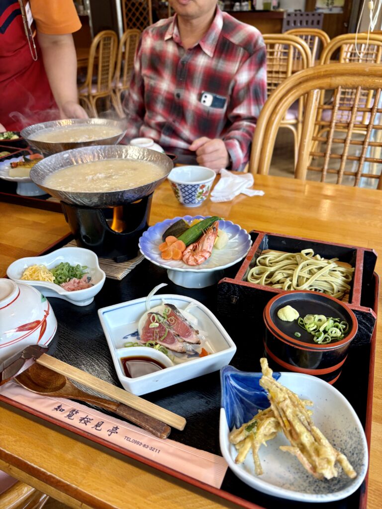 平和会館近くの【知覧桜見亭】で郷土料理を食べます。刺身醤油と蕎麦つゆが甘かったですが、すべて美味しかったです😋。