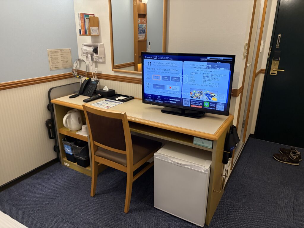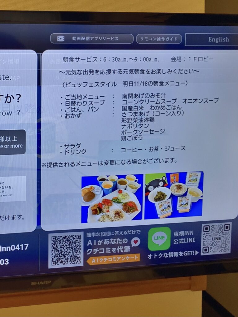 【東横イン】にチェックイン。明日の朝食メニューが気になります。荷物を置いていると、鹿児島所長からロビーに着いたと連絡が入ります。一昨日、1日中相手をしてくれたのに、今日も忙しい中夕食に誘ってくれました🤗。
