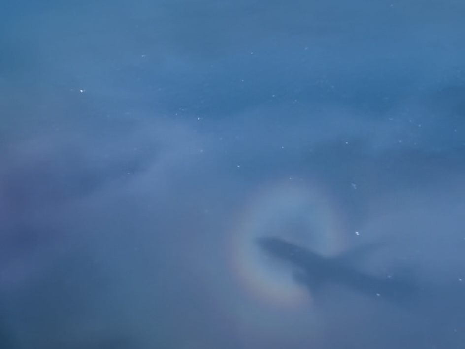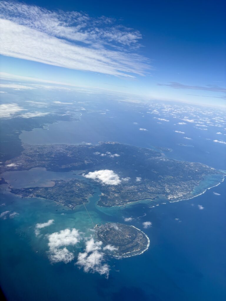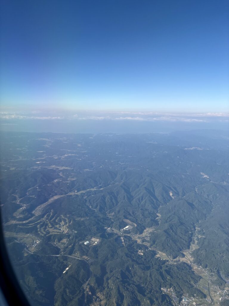 離陸してからしばらくは山の風景が続きます。うたた寝をして起きたときは、青い海に沖縄の島々が見えました。本島南部の海を旋回している時、飛行機の影に虹色の輪ができる「ブロッケン現象」が見られました🤗。画像が粗くてすみません。