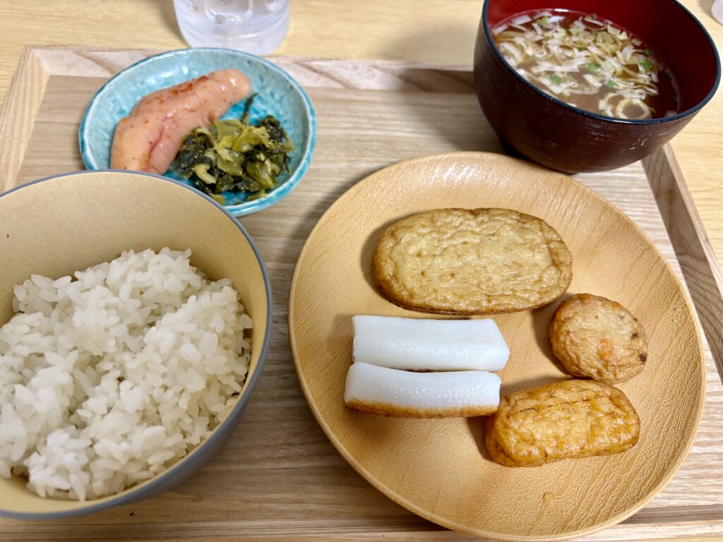 夜ごはんは鹿児島で買ったさつま揚げと明太子です。宮古島ではおいしい明太子が食べられないので、久しぶりにちゃんとしたものが食べられました😊。甘いさつま揚げも美味しかったです😋。