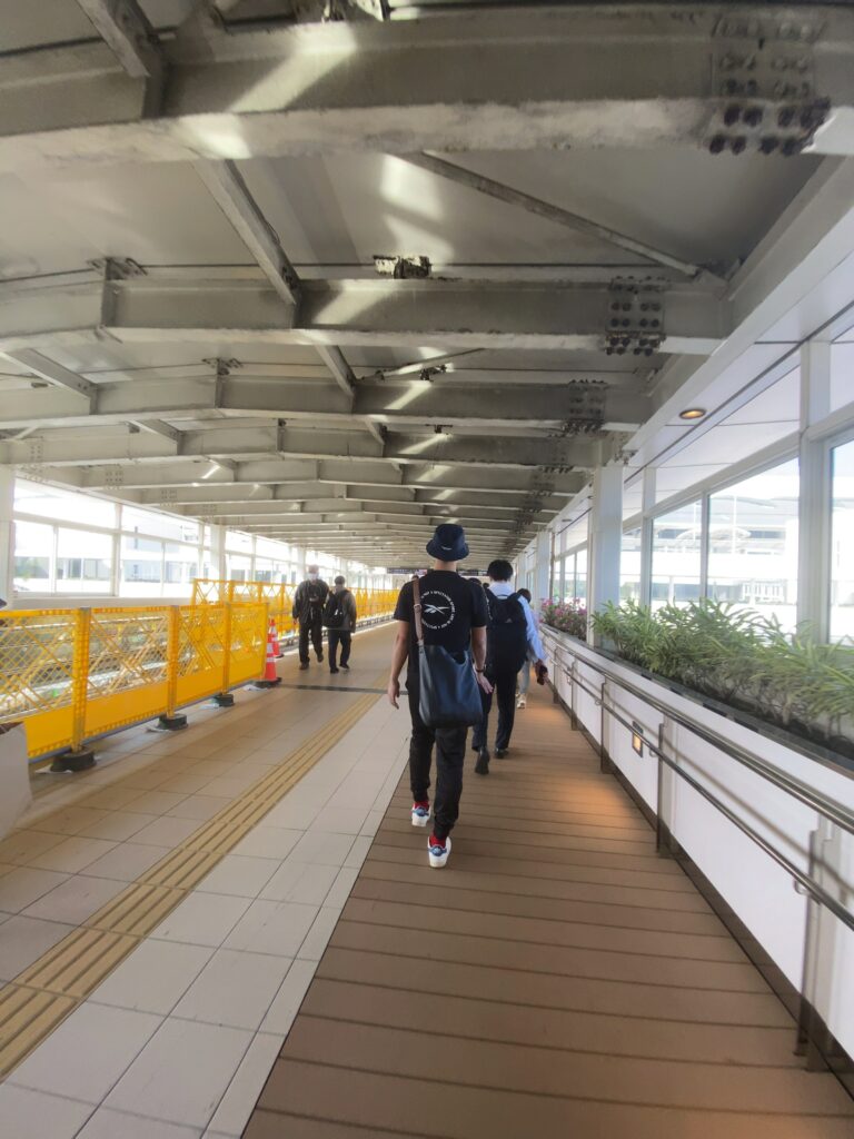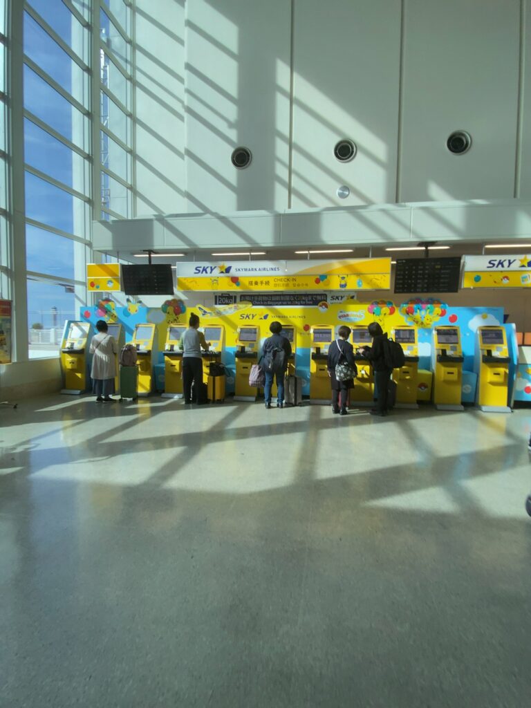 那覇空港駅からのコンコース、しばらく工事中でしたが工事が終わり動く歩道が撤去されていました。通路が広くなりました😃。出発フロアに上がり、スカイマークでセルフチェックインをして搭乗券を受けとります。羽田行きの飛行機は高級なシートでした😃。