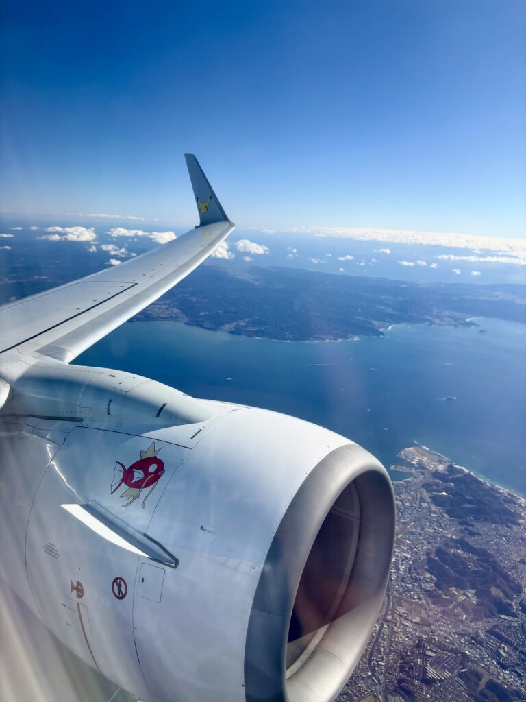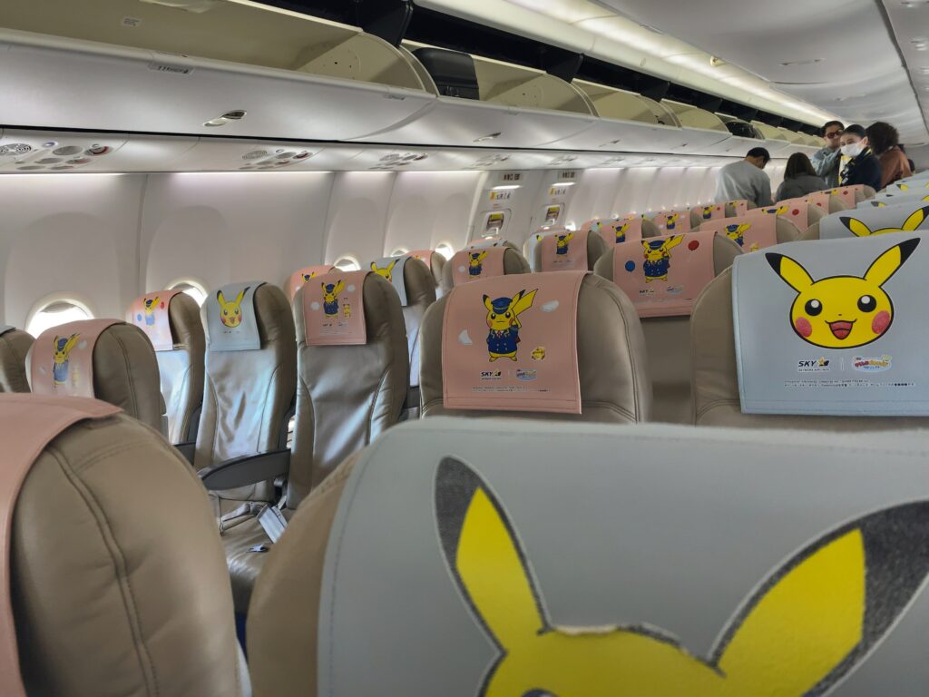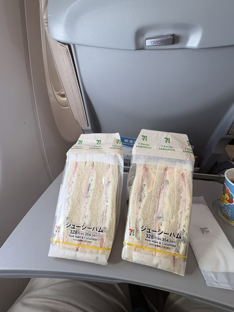 機内に入り驚いているとCAが“ピカチュージェット2号機です”と説明をしてくれます🤗。今日は比較的空いて、横の席に人がいなかったののんびり過ごせました。昼ごはんは【セブンイレブン】のジューシーハムサンド2個でした。