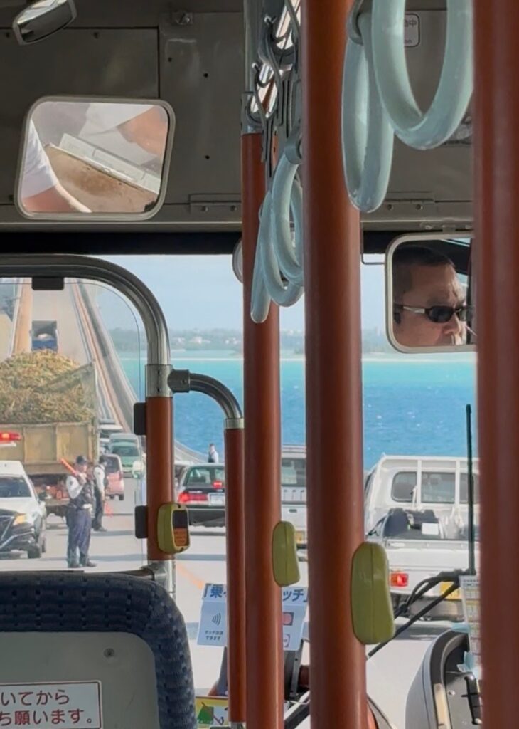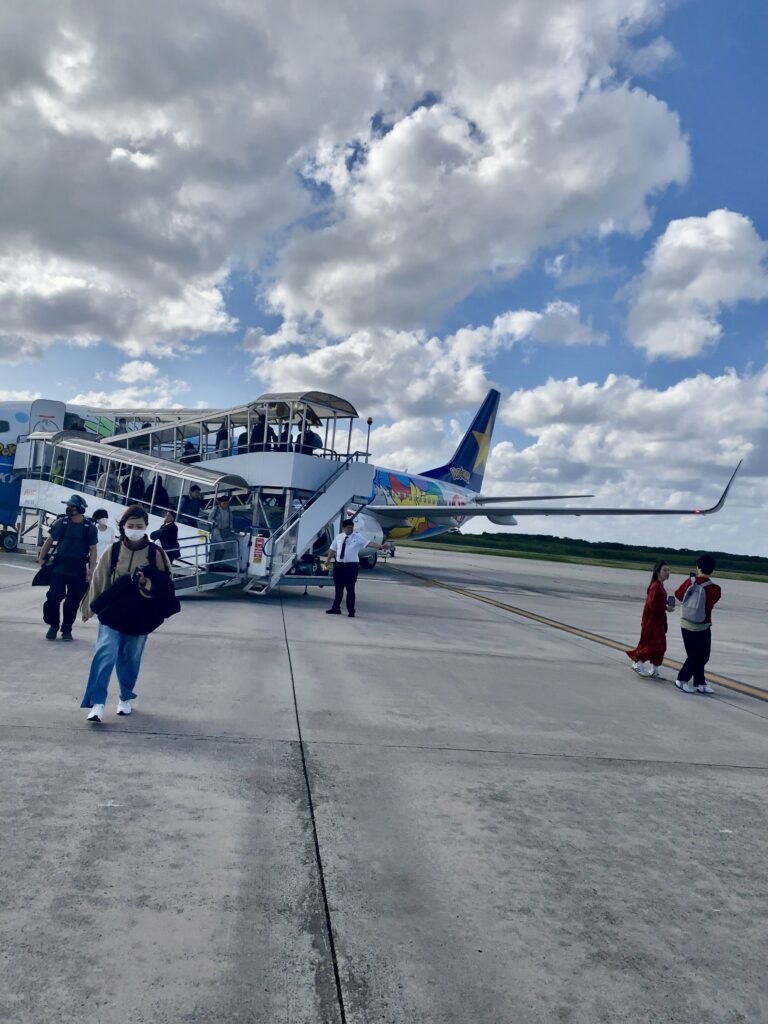 強い向かい風の中、わすが5分遅れで下地島空港に到着。タラップから降りる時の強風に皆さん楽しそうです。雨だとこうは行きません😄。15時発のバスに余裕で間に合いました。