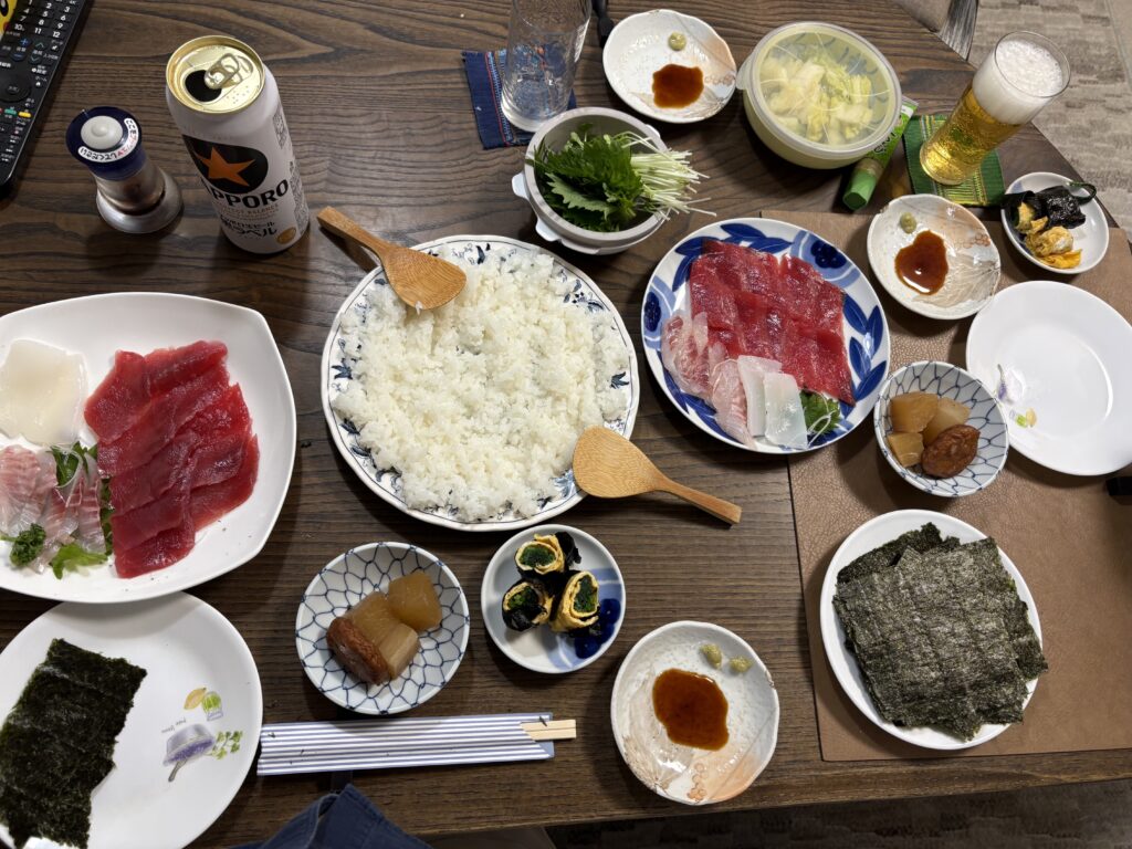夕方実家へ行き、晩ごはんに手巻き寿司を食べます。一人暮らしでは食べる機会がないので、ありがたいです😊。