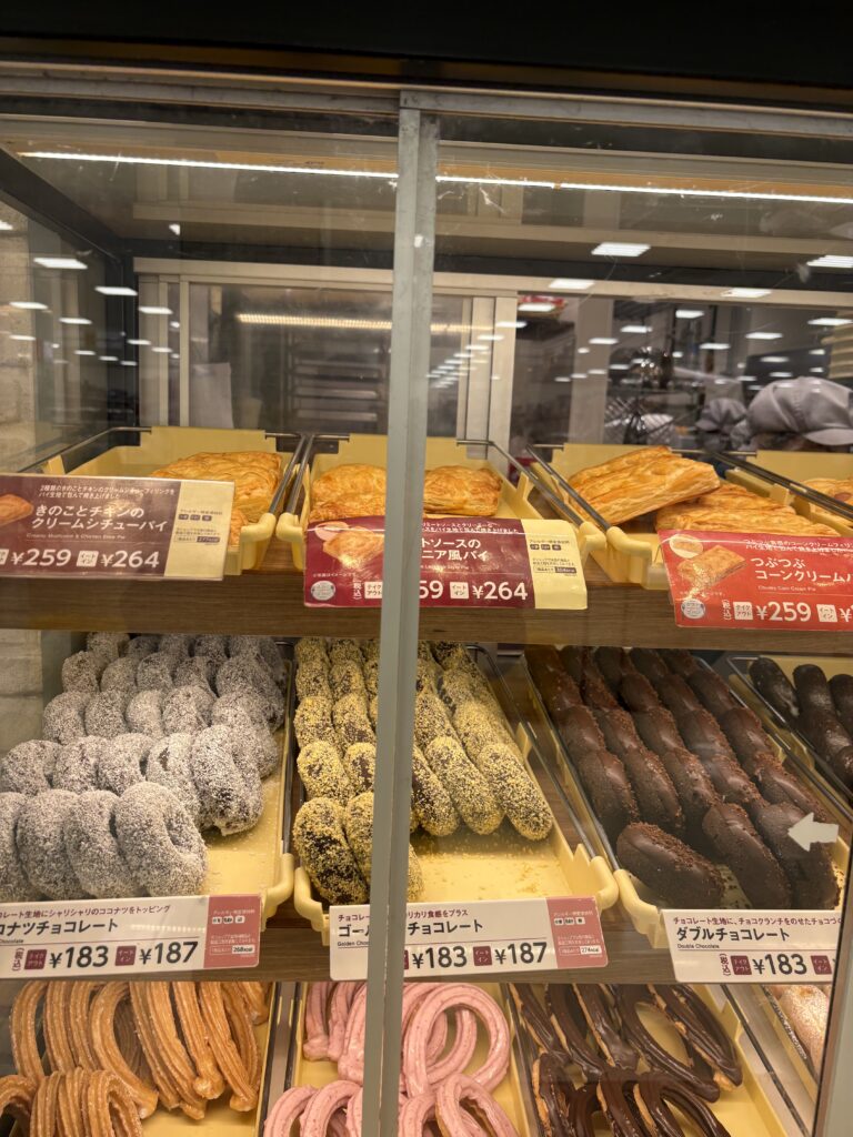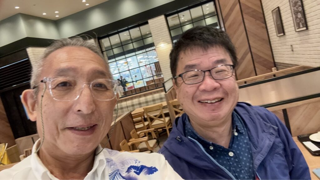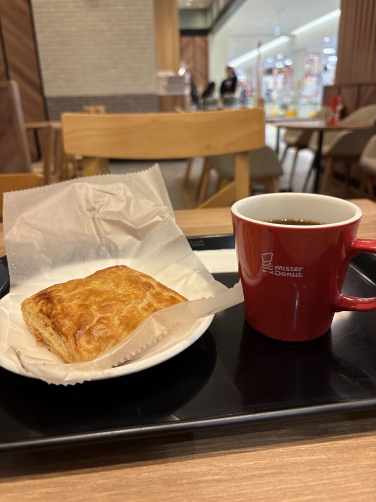 その後【ミスタードーナツ】へ。寒かったので温めてもらった熱々のパイを食べてます😊。仕事をしていると友人の藤井ちゃんが声をかけてくれました。