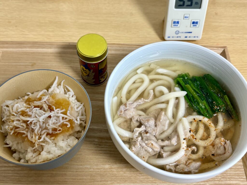 昼ごはんは肉うどんとしらすおろしごはん。午前中にサンエーで買った「にんべん」の白だしを使います。普段と違い上品な味になりました🤗。