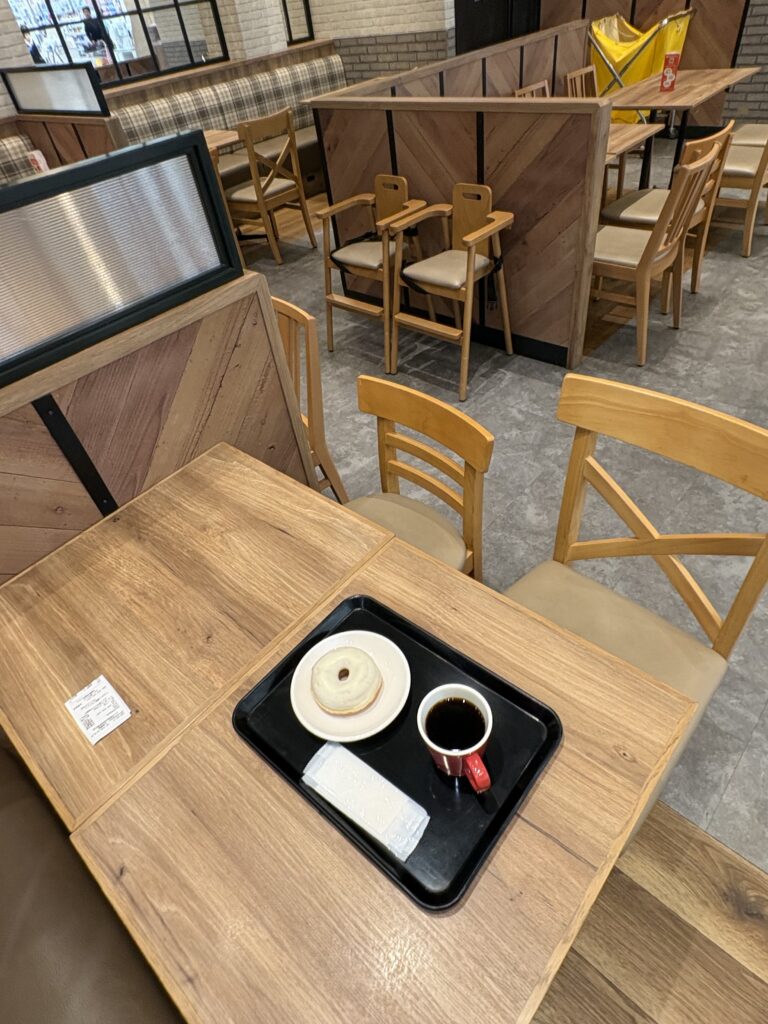 その後【ミスタードーナツ】へ。今日はこの服装では寒いです。いつもここに座って仕事をします。朝からLINEで不快なやり取りがありますが、コーヒーを飲んで穏やかな気持ちを取り戻しました🤗。