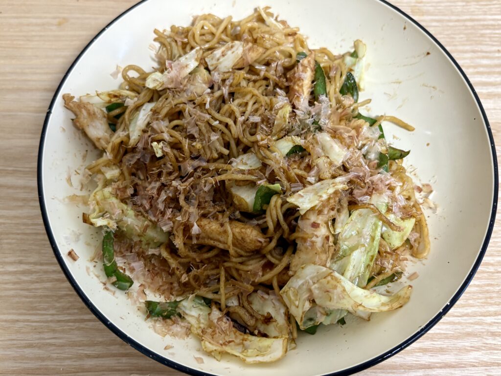 お腹が空いて17時に晩ごはんを食べます。3食入りのマルちゃん焼きそばを食べ切りました。豚肉の代わりに鶏肉を使ったのですが、意外においしかったです。
