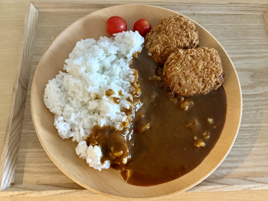 帰宅後すぐに昼ごはんにします。時間がないのでご飯を電子レンジで温め、【無印良品】のレトルトカレーを湯煎、サンエーで買った牛肉入りコロッケをトッピングして食べました😃。
