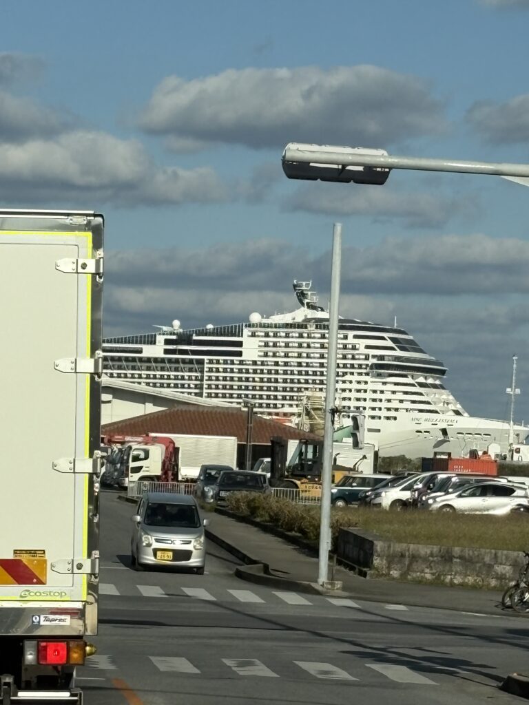 7時起床、9時前に出発。昨日に続き今朝もいい天気です。平良港に大型クルーズ船が寄港しています。