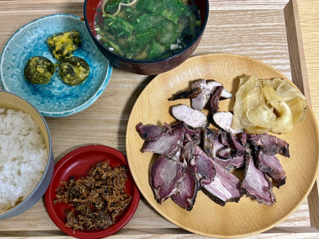 晩ごはんのメインは、先日のお客様からお土産にいただいた「ちりめん山椒しぐれ煮」と、アナタビ常連さんのご主人が作った「猪の燻製といぶりがっこ」です。全部美味しかったです😋。お土産をいただく機会か多く、うれしい限りです😊。決しておねだりをしているわけではありませんので😆。