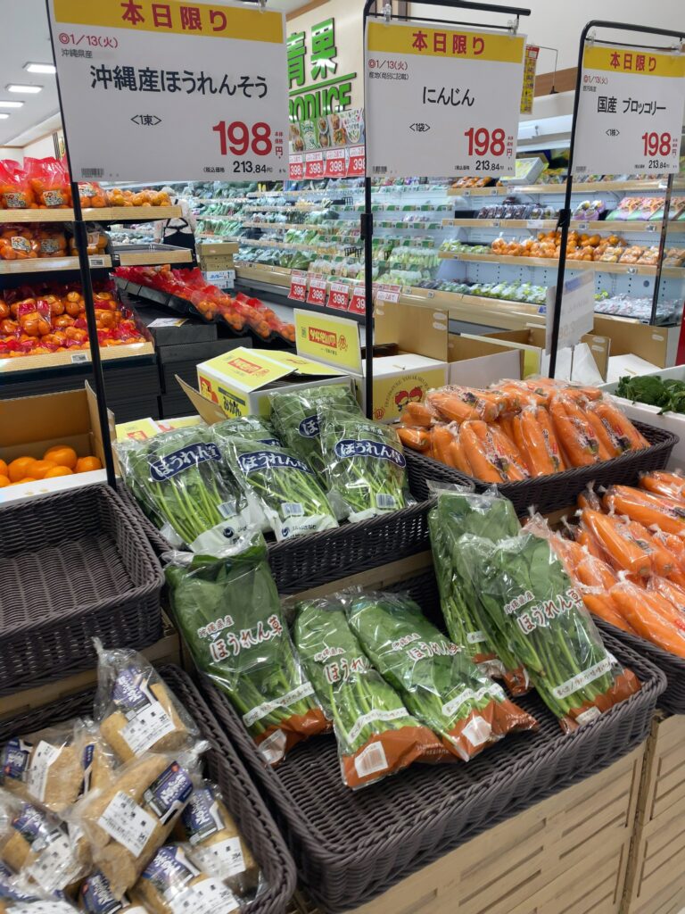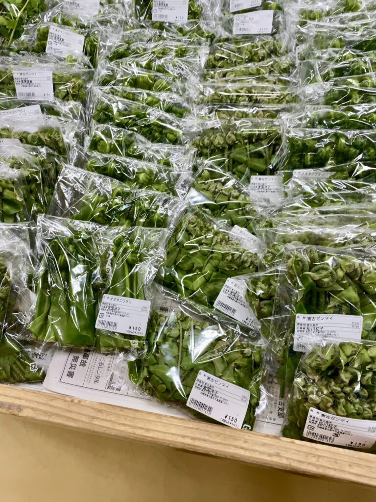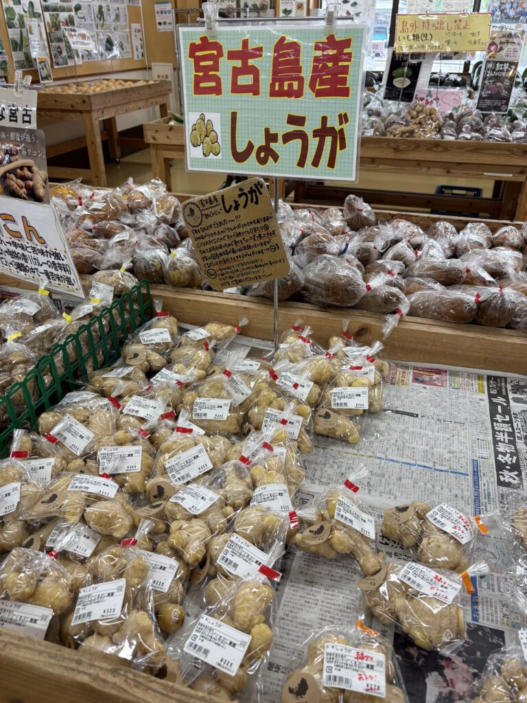 【あたらず市場】にシュガープラムを買いに行きますが、売り切れです。宮古島産の野菜が増えていて、大野山林のツアー中に見かけるオオタニワタリも売られています。宮古島産のしょうがを購入。これでガリ(新生姜の甘酢付け)を作ろうと思います😃。