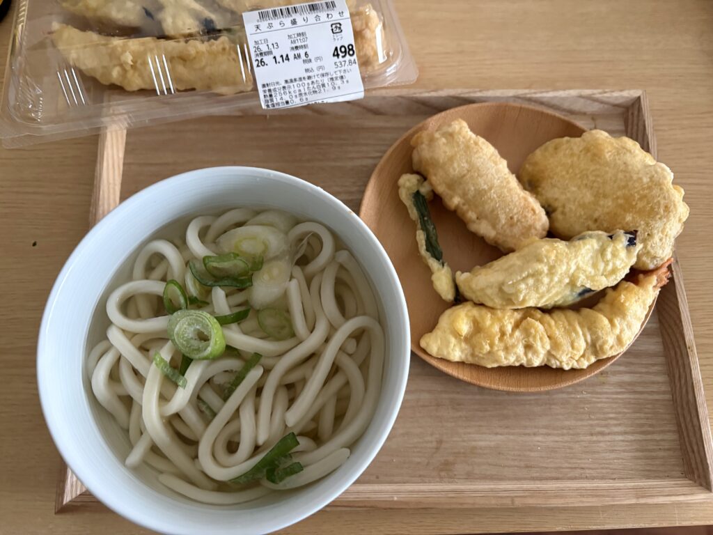 昼ごはんは、安いと言う理由で買ってしまった天ぷらと温かいうどんです。天ぷらは半分の量を食べました😃。沖縄の天ぷらは衣でお腹がいっぱいになります😆。