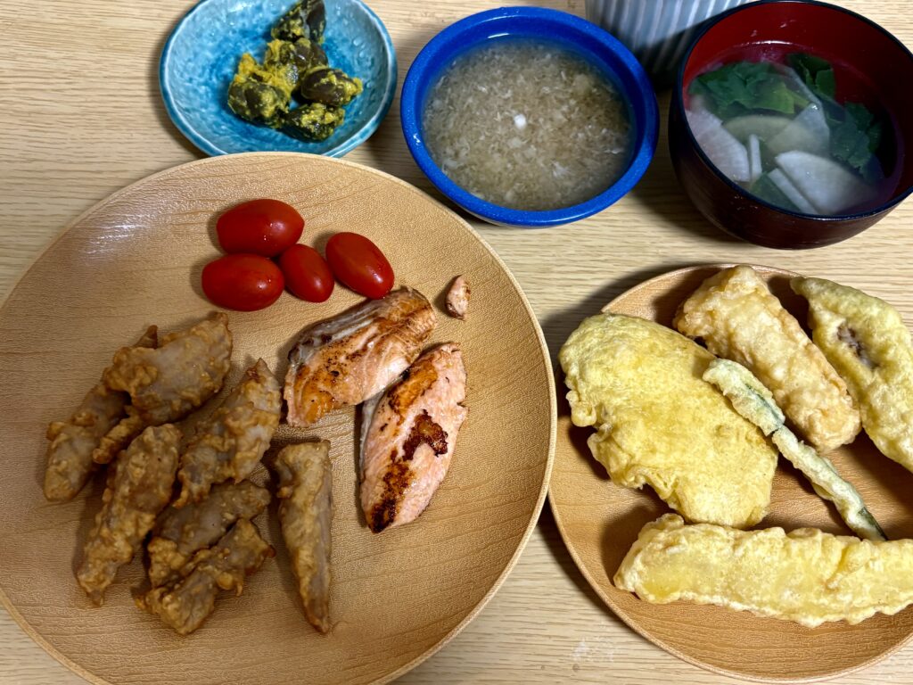 晩ごはんはお昼に食べた天ぷらの残り半分とマグロの唐揚げ、サーモンの塩焼きです。久しぶりに家で泡盛を飲みました。宮古島産の野菜中心の食事にしたいと思ってはいるのですが💦。