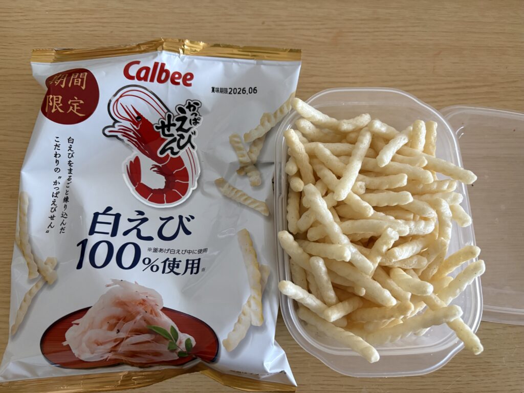 晩ごはんはさつま揚げがメインです。お腹いっぱいにならず、かっぱえびせん白えびを食べました。コレは美味しいです😋。