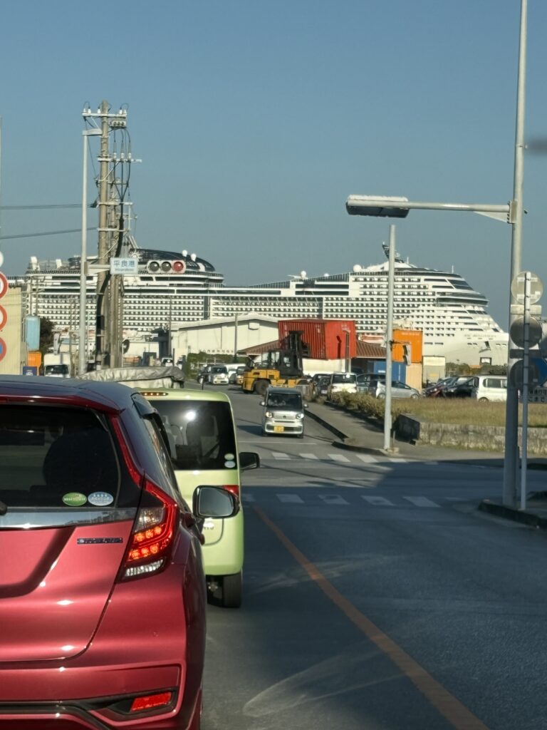 7時起床、9時前に外出。トゥリバーへ向かう途中、平良港バースに大型クルーズ船が停泊。すでに船から降りた観光客がぞろぞろ歩いています。