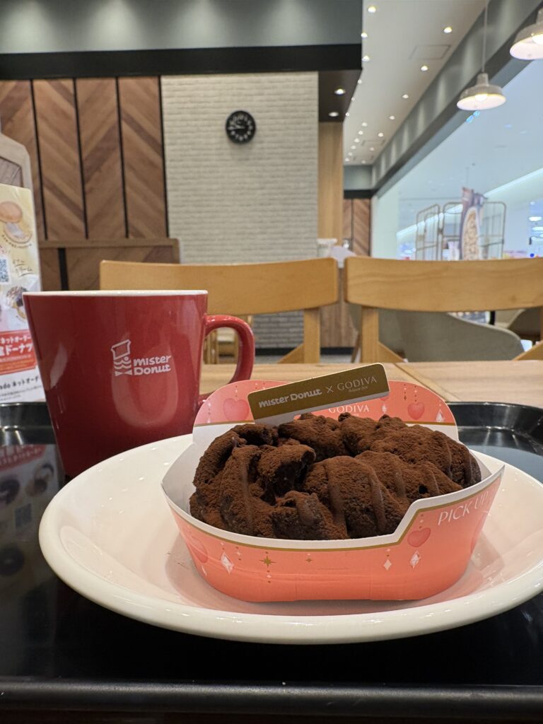 その後【ミスタードーナツ】に入店。GODIVAとのコラボドーナツ3種類目を食べます。ココアパウダーが手について食べにくかったですが、ドーナツは美味しかったです😃。昼のミーティングの準備で、議題の確認をしました。
