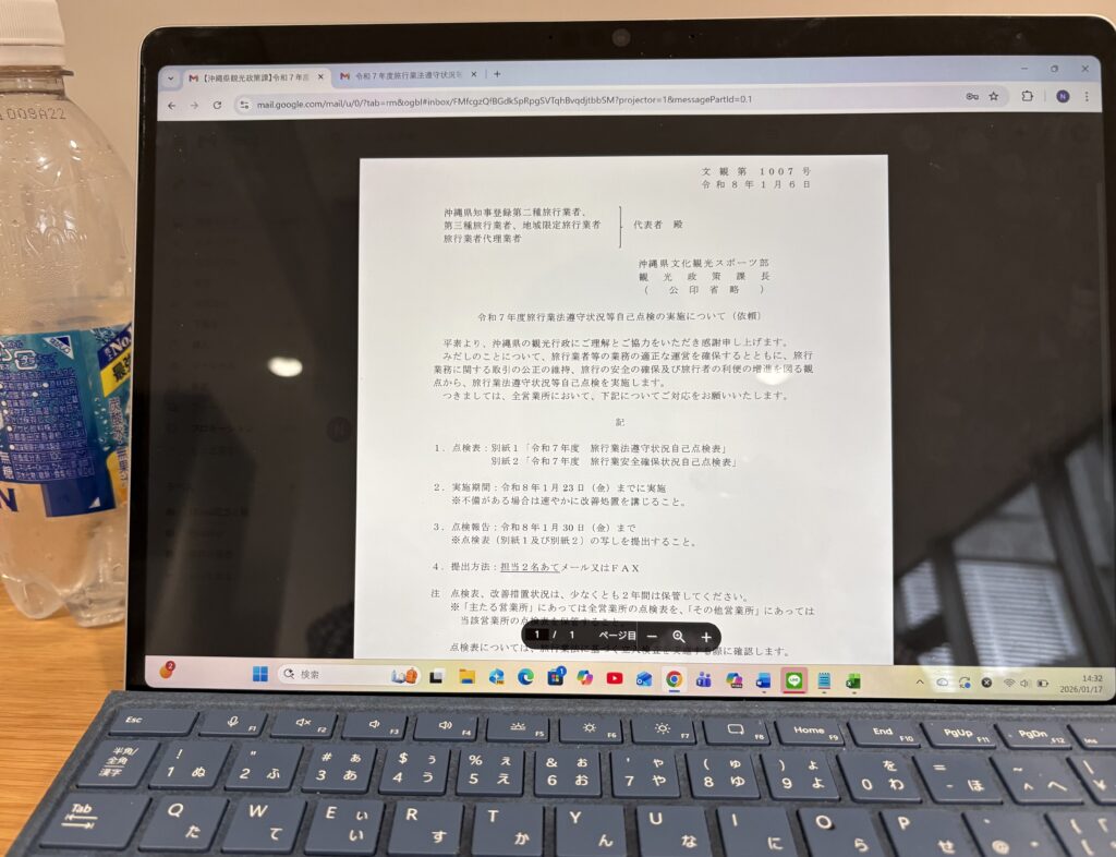 午後は【未来創造センター】の図書館へ。駐車場にはかなりの車が停まっていましたが、図書館は空いています。沖縄県観光政策課から依頼があった「令和7年度旅行業法遵守等自己点検の実施」に関する実施結果報告書を作成し、メールで送りました😃。