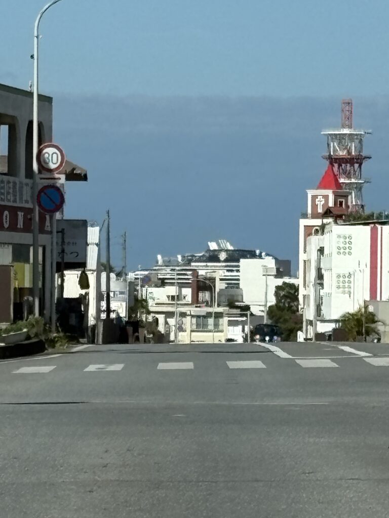 自宅へ帰る途中「第三給油所」の交差点で信号待ちをしていると、正面に大型クルーズ船が見えます。こんな遠い場所から見えるんだと驚きました😮。