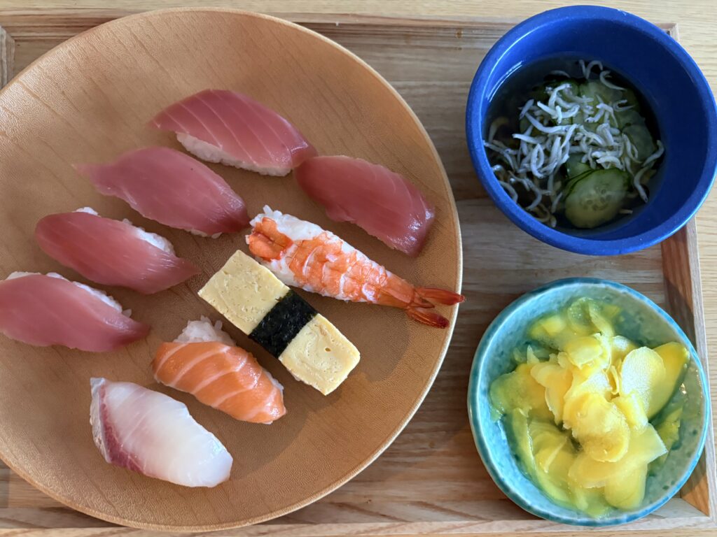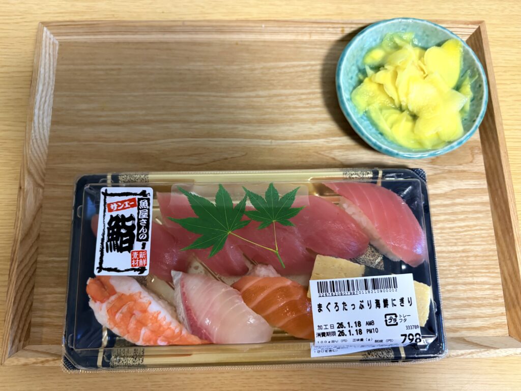 昼ごはんはサンエーで買った握り寿司です。自家製ガリを美味しく食べるために、少し高めの商品を購入。お寿司もガリも美味しかったです🤗。ガリは改良すればもっと美味しくできそうです。