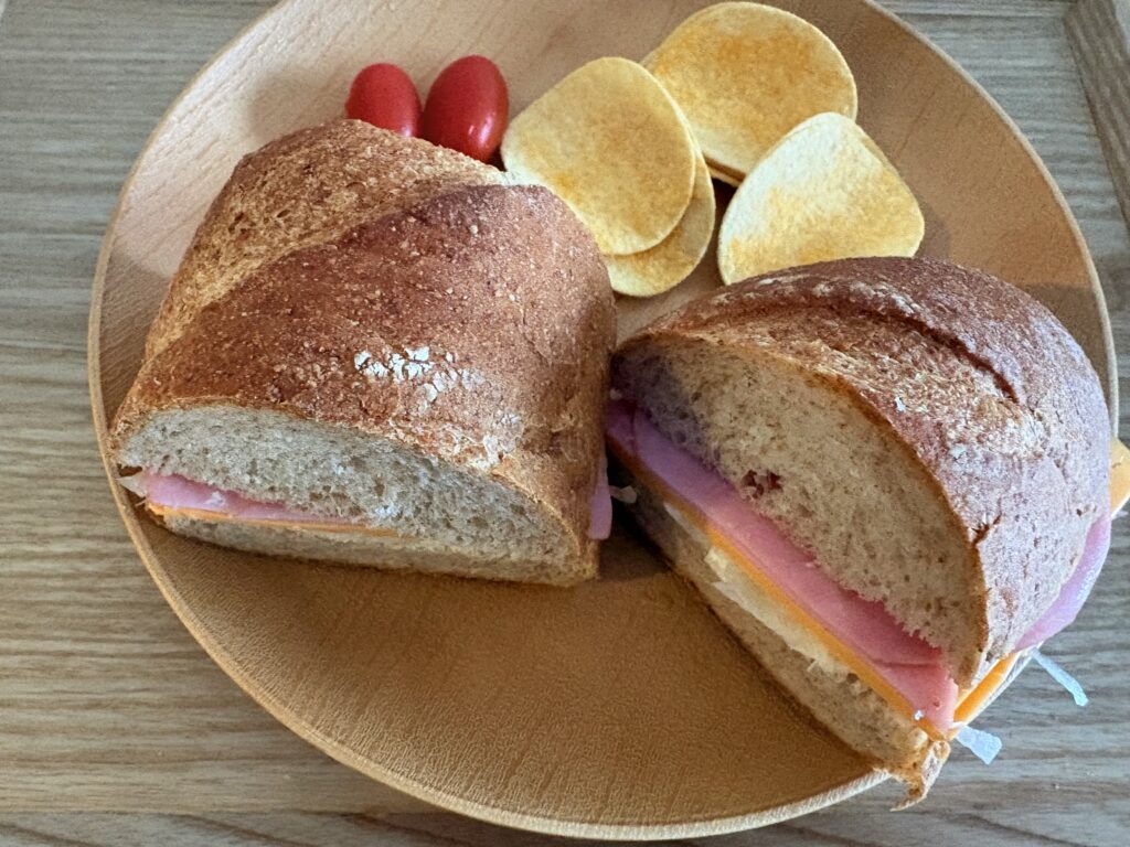 サンエーで買ったのはチェダーチーズ、タマネギ、チップスのみ。昼ごはんに必要な食材だけ購入しました😃。富士パンのハードパンを使ったサンドイッチは美味しかったです😋。