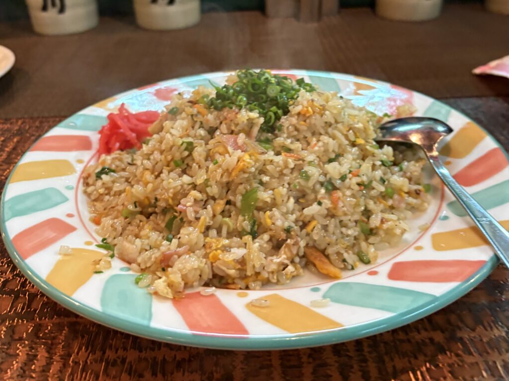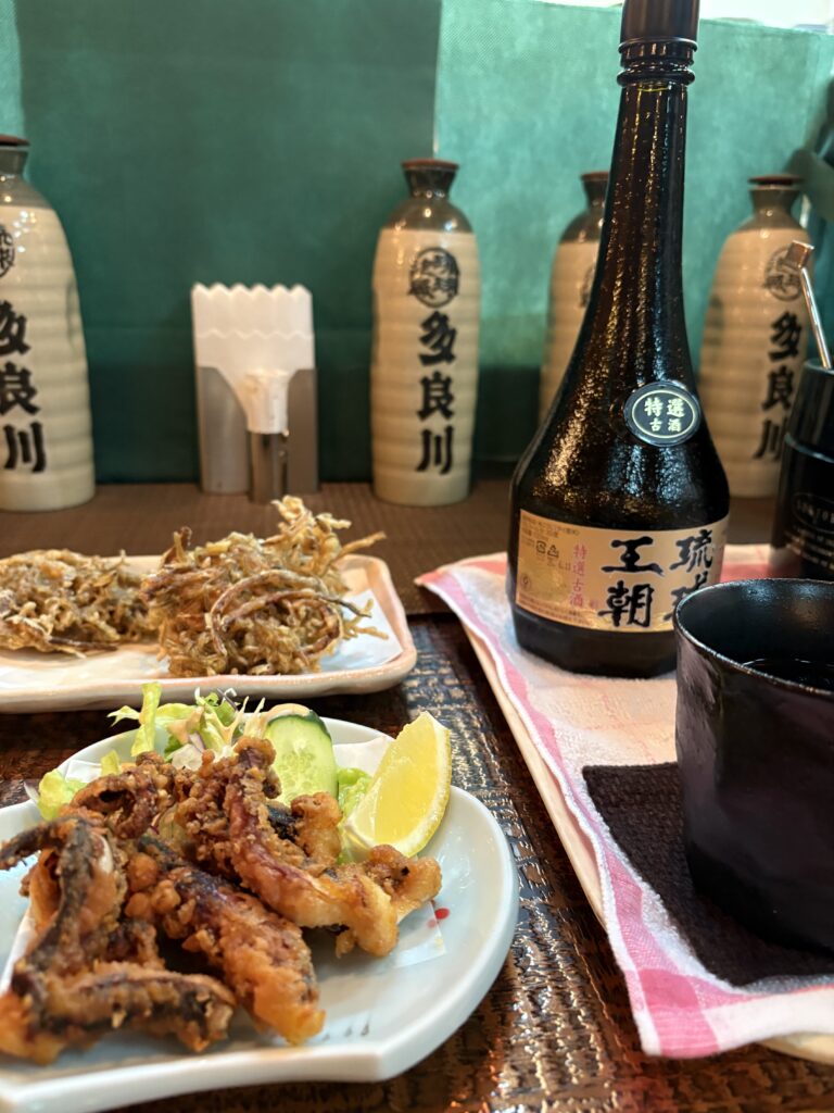 18時前【居酒屋三幸】に入ります。“お久しぶりです。今年初めてですね😃”と料理長が迎えてくれます。数分後、“今まで90人の修学旅行の夕食のヘルプに行ってました😃”と店長が戻って来ます。まずは生ビールとお通しから。その後、琉球王朝に変えて、もずくの天ぷら、イカ下足唐揚げ、〆はチャーハンです。前半はお客がいなかったので3人で楽しく雑談ができました🤗。