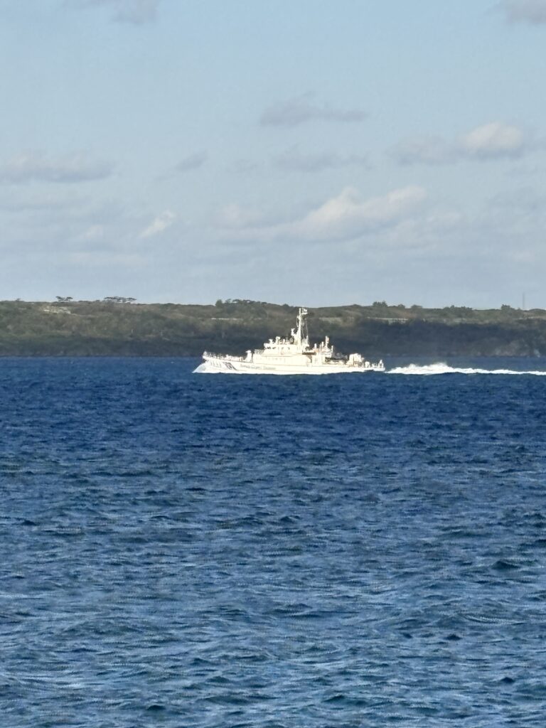 9時ごろトゥリバーに到着。朝は曇っていましたが、ウォーキング中に日差しが出てきます。するとヒルトンホテルから、誰もいなかったビーチに続々と人が出てきます。防波堤を歩くと久しぶりに海上保安部の巡視船が見えました😃。