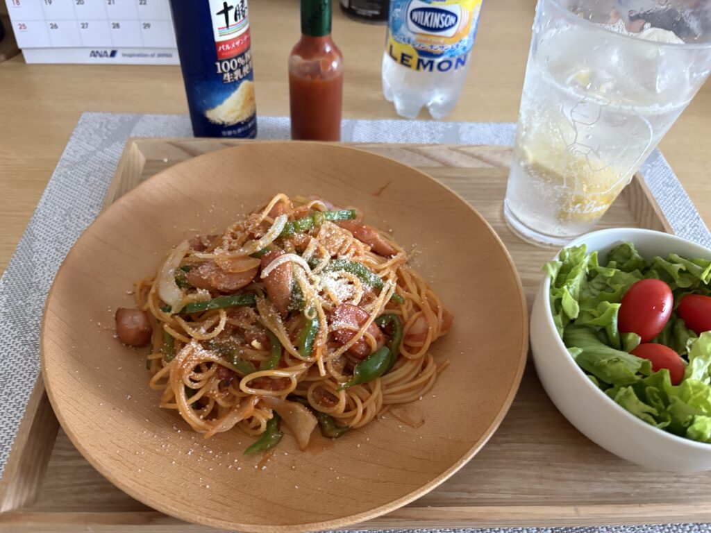 昼ごはんにナポリタンを食べます。ピーマン、ミニトマト、リーフレタスは宮古産です。