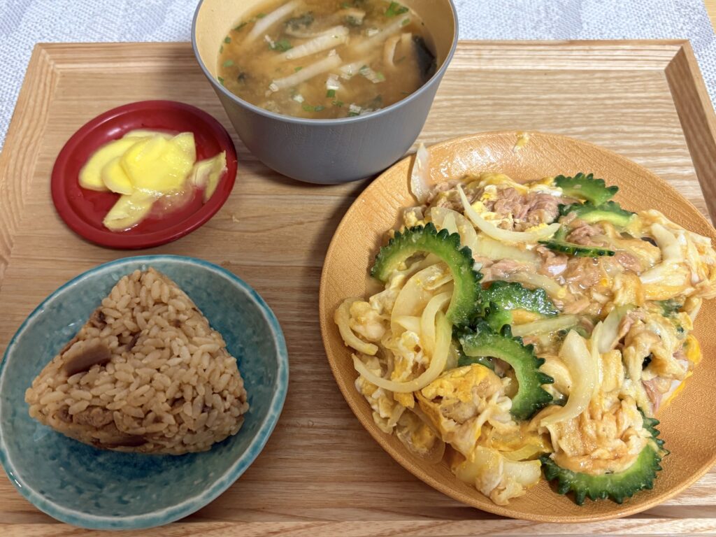 晩ごはんはゴーヤーチャンプルーを作って食べます。鶏めしは1個では足らず2個食べました。今日はお金を使わず支出がゼロでした🤗。