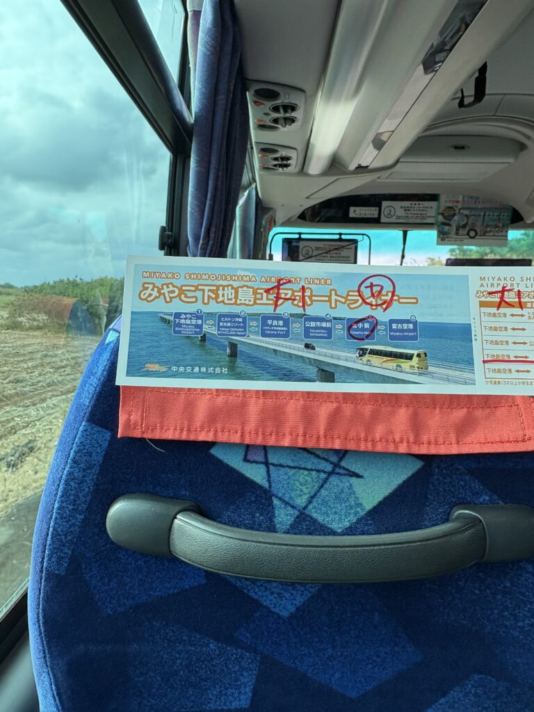 15:25北小前停留所に「みやこ下地島エアポートライナー」が到着。サングラスをかけた運転手が笑顔で手を振っています😎。誰?と思いながら手を振り返しバスに乗り込むと、運転手は友人でした😆。中央交通に就職した話は聞いていましたが、まさかここで会うとは😮。空港でバスを降りてから、友人に“新人とは思えない落ち着いたアナウンスと運転でしたよ♪”。