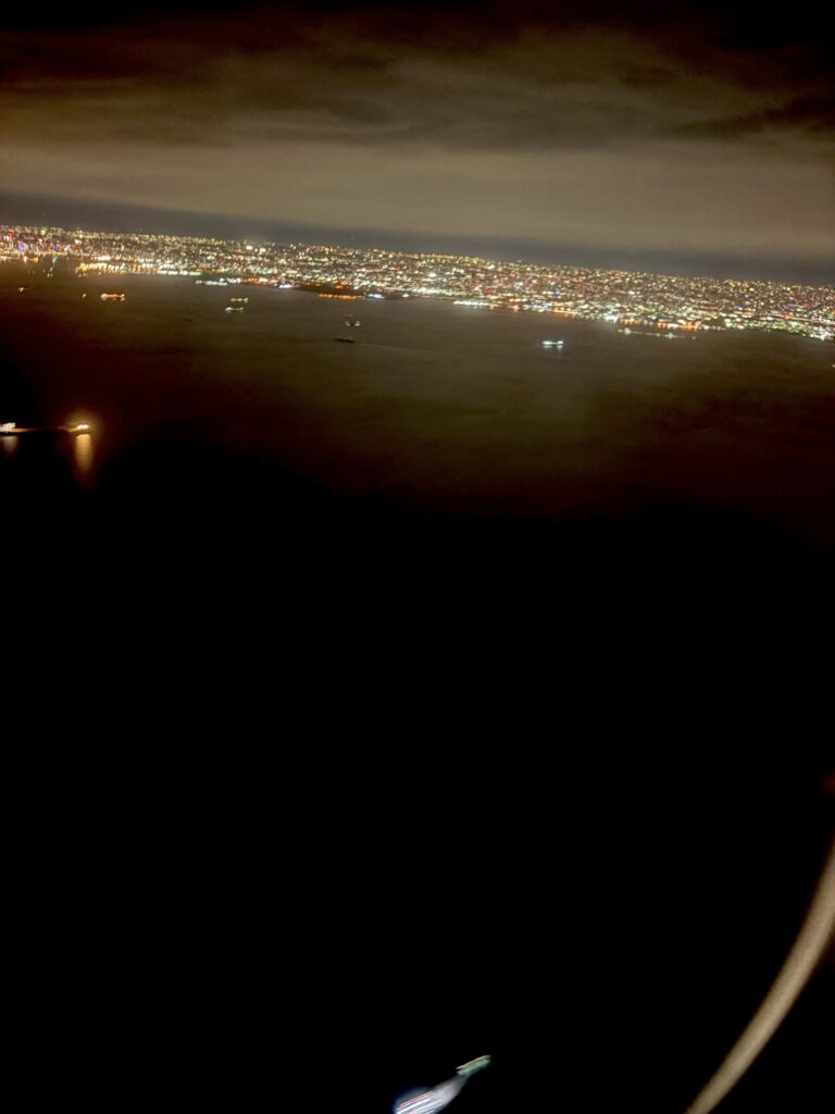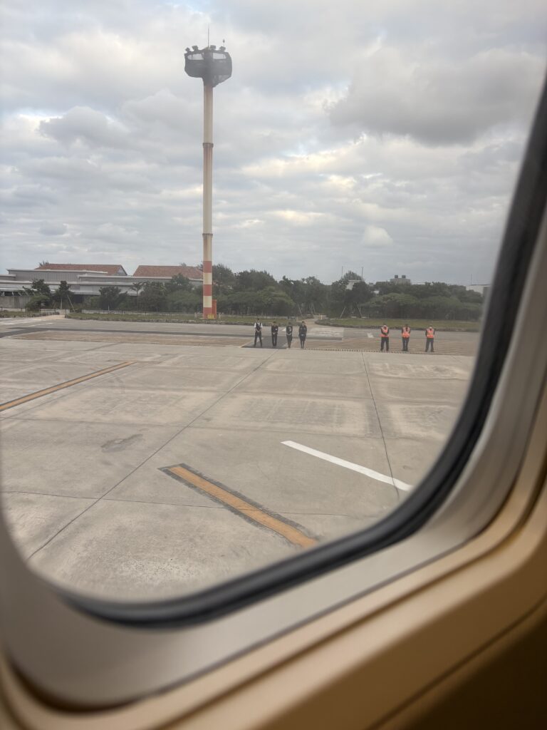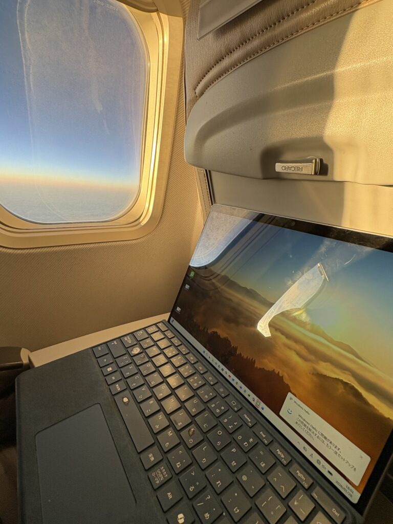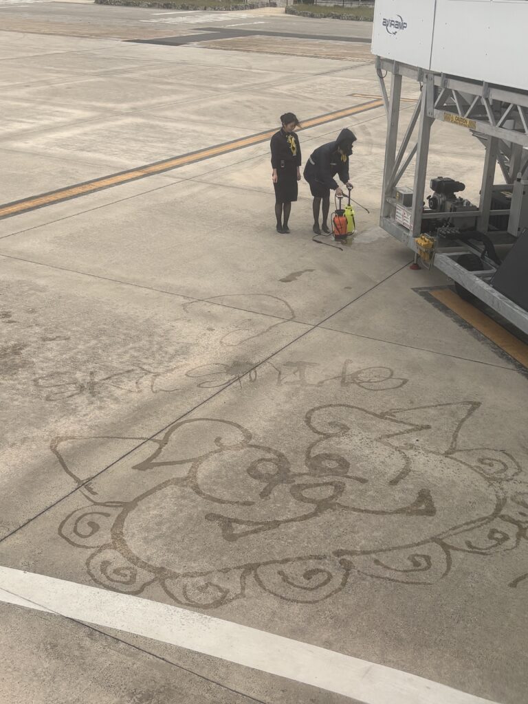 空港ラウンジで1時間仕事ができました。17:05に搭乗開始。1番はフォワードシートの優先搭乗なので、一般席では私が1番乗りです😃。窓からは水アートを描く作業がよく見えました🤗。その後出発を待っていると“愛川さーん、お久しぶりです。”と【ツンフグ牧場】のあっちゃんが声をかけてくれます。飛行機が動きだす時、総勢10名のスタッフが大きく手を振ってくれて感動しました😊。