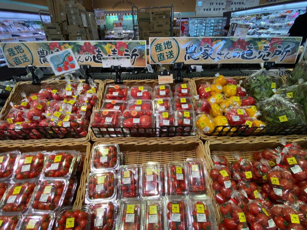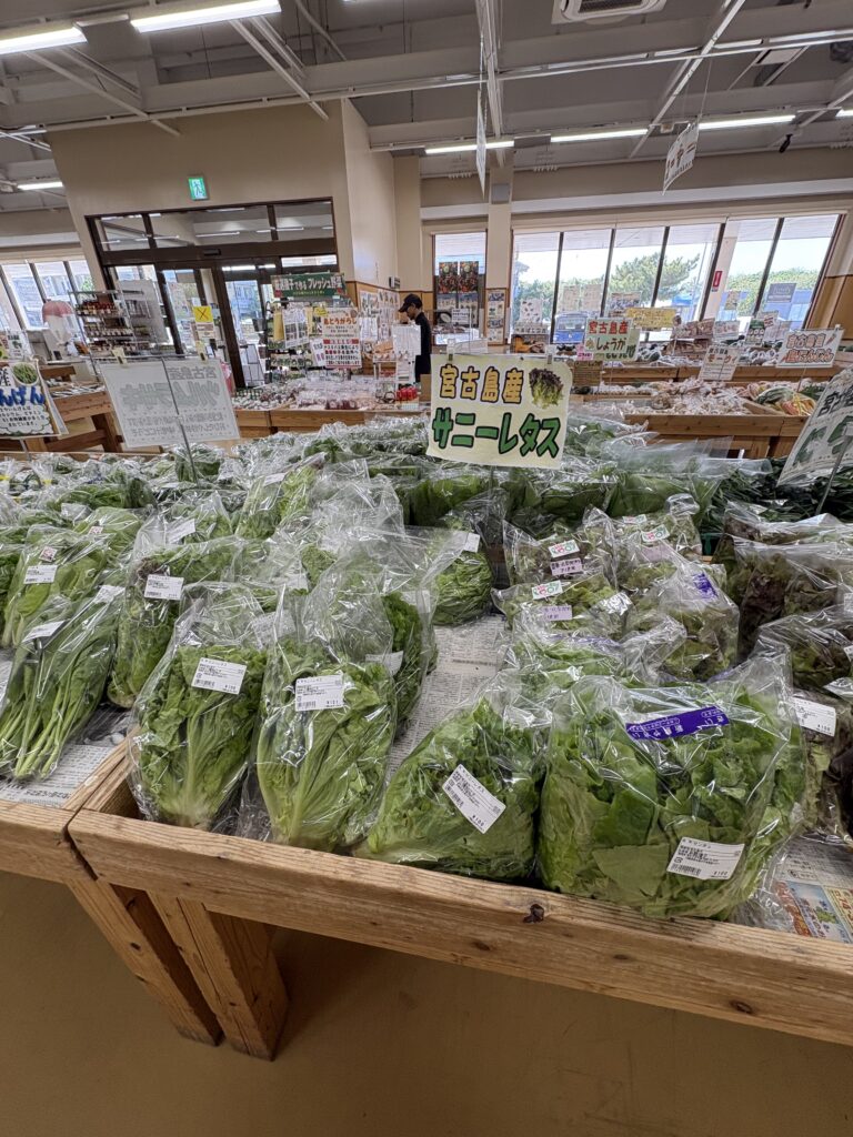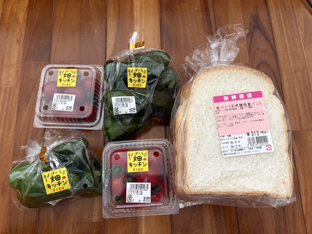 サンエーで【富士パン】の食パン、あたらす市場でリーフレタスとタマネギ、マックスバリュ南店で【まるごと宮古島】のピーマンとミニトマト(ほれまる)を買って帰ります。