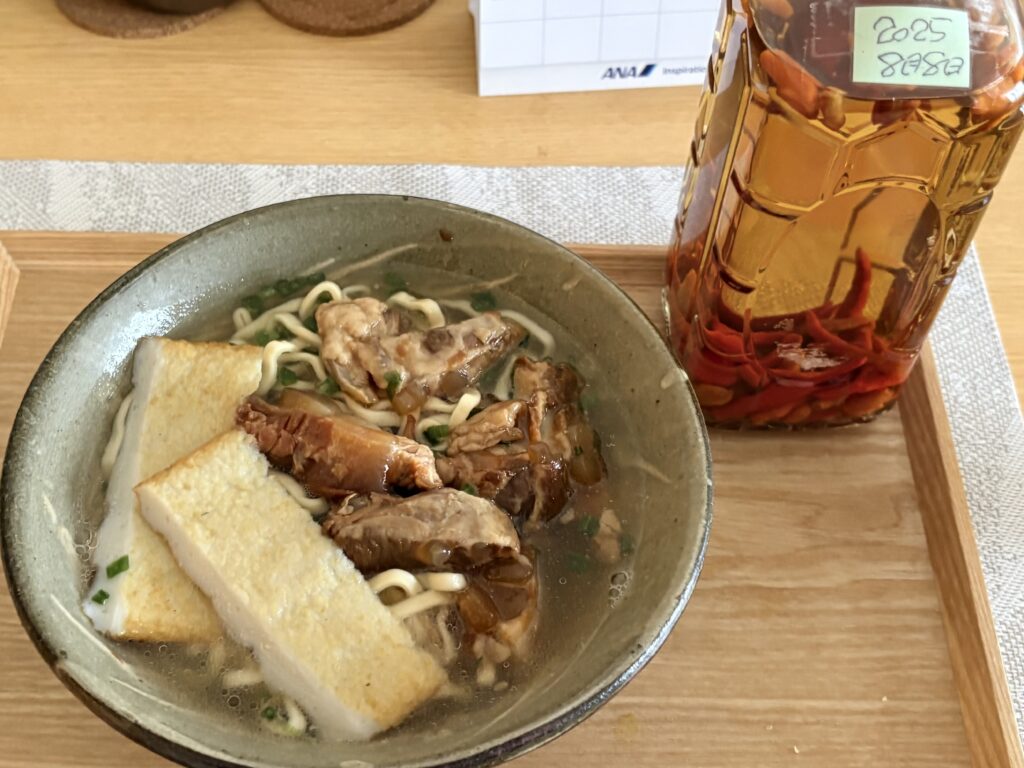 昼ごはんはローソンの沖縄そばです。湯通しをした麺にスープをかけ、具材の軟骨ソーキとかまぼこを盛り付けて完成です。最近【BAR HERSHE】のひろゆきからもらった自家製コーレーグースをかけて食べます。おいしさが倍増しました😋。