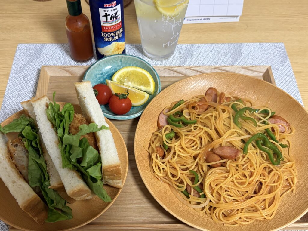 【富士パン】の食パンでコロッケサンド、【まるごと宮古島】のピーマンを使ってナポリタン、それとほれまる(ミニトマト)。宮古島でないと食べられない豪華な晩ごはんです。友人はパンを作り、もう1人の友人は野菜を作っています。