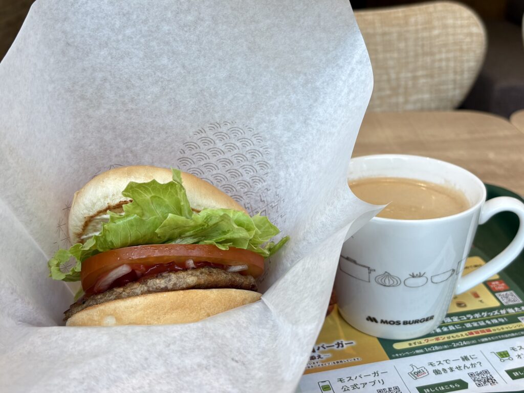 10時過ぎ【モスバーガー】に入店。約1ヶ月ぶりです。モーニング野菜バーガーとコーヒーのモーニングセットが540円。よその店が値上げしているので、今では安く感じます🤗。仕事をしていると、ねえねえのグループが入ってきて一気に賑やかになりました😃。
